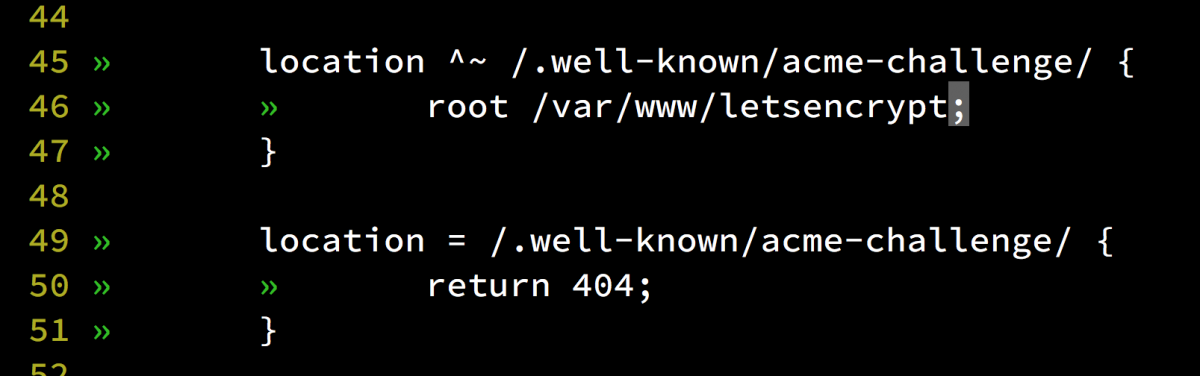 以下の設定では, /.well-known/acme-challenge/ 以下へのアクセスの root を /var/www/letsencrypt に設定しています. また /.well-known/acme-challenge/ にアクセスがあった場合 403 が返ることを防ぐために, /.well-known/acme-challenge/ へのアクセスには 404 を返しています.
